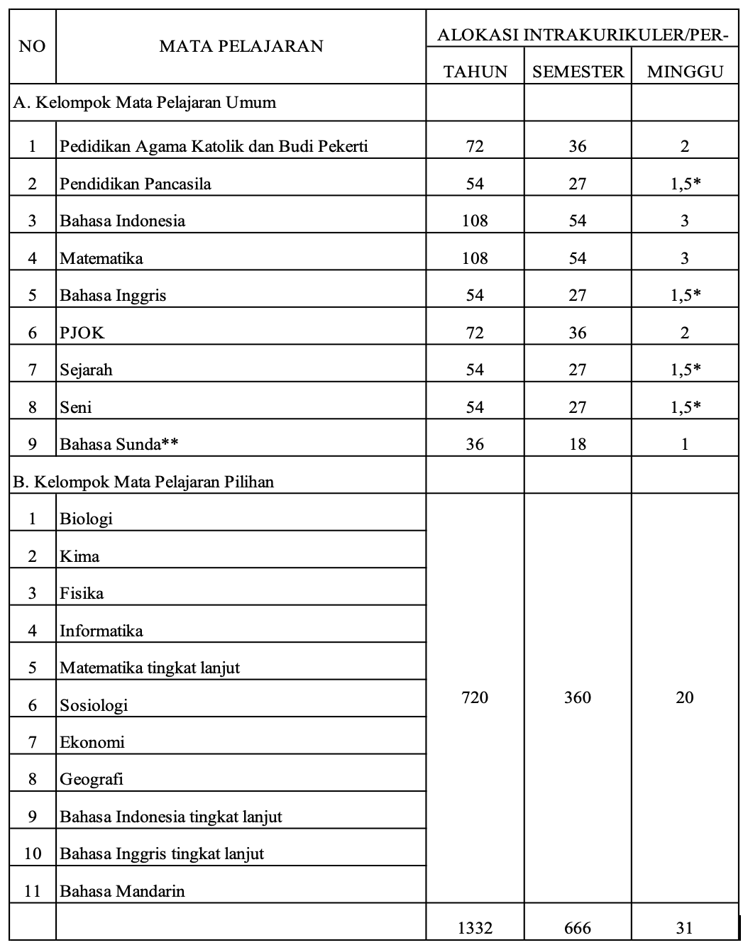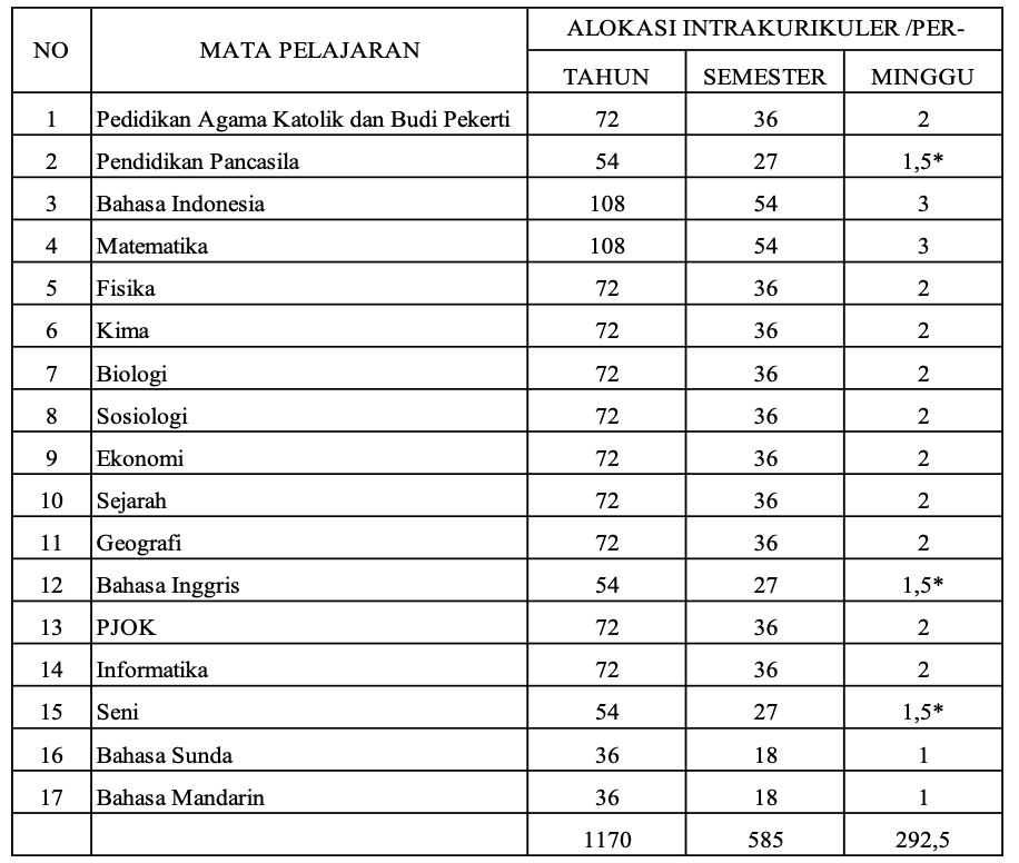 Struktur kurikulum fase E (Kelas X) di SMA Pangudi Luhur II Servasius mengacu yang mengacu pada Permendikbudristek No. 262/M/2022, dapat dilihat pada tabel berikut :
