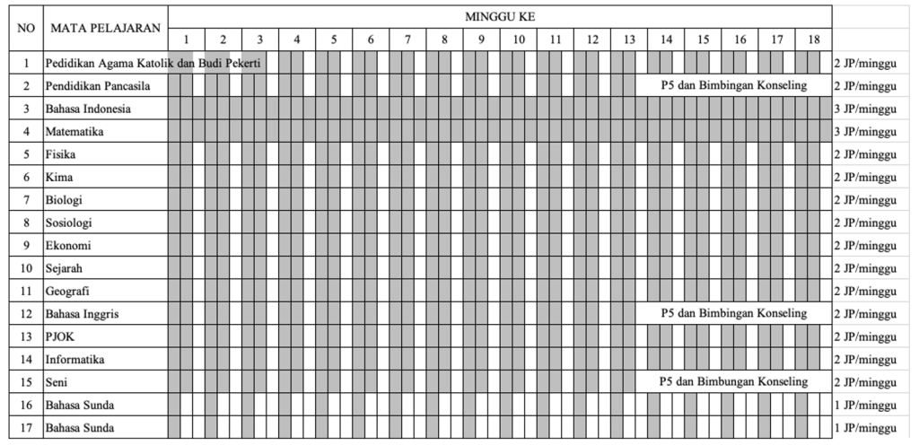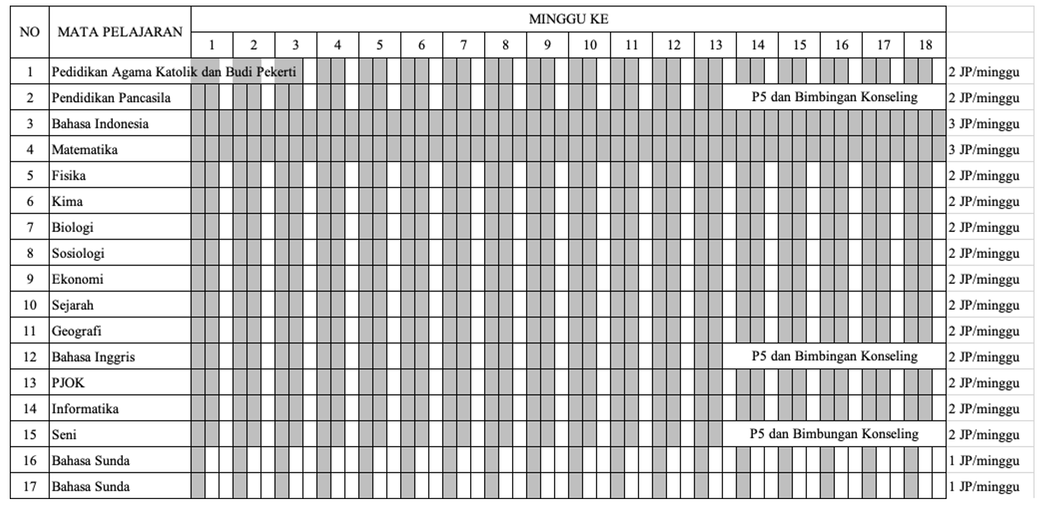 Struktur kurikulum fase E (Kelas X) di SMA Pangudi Luhur II Servasius yang mengacu pada Permendikbudristek No. 262/M/2022, dapat dilihat pada tabel berikut :